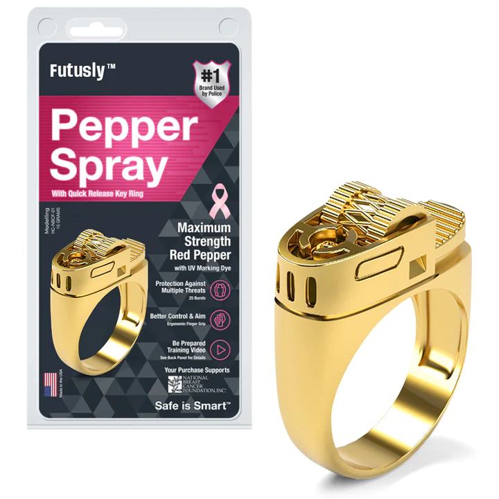 A discreet and camouflaged option for personal protection is the pepper spray ring. The Futusly™ Speederupt 30 Bursts Pepper Spray Ring serves to deter potential attackers and safeguard you in case of an assault. The replaceable pepper spray canisters make maintenance easy, and the ring can be comfortably worn on either the first (index) or second finger of your dominant hand. Ensuring accessibility, the thumb (or alternate hand if needed) can readily operate the safety latch and trigger. Pepper spray rings are an excellent choice for concealed carry and provide a reliable option for emergency situations.